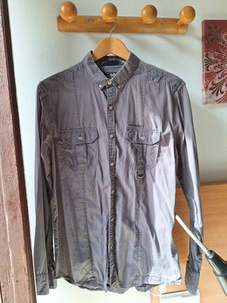 Bonita camisa de manga larga para hombre. El cuello tiene desgaste y donde están los botones de repuesto se ha dañado la tela también. La talla creo que es L pero no puedo confirmarlo porque ya no se ve en la etiqueta. Si te interesa puedo darte medidas sin problema. - Cuello con botones. - Dos bolsillos en el pecho. - Detalle de anilla metálica en un bolsillo.