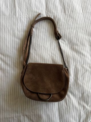 Bolso bandolera de ante con un diseño moderno y versátil. - Cierre de solapa. - Detalle de anilla metálica en la parte frontal. - Correa ajustable para llevar al hombro o cruzado.