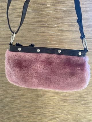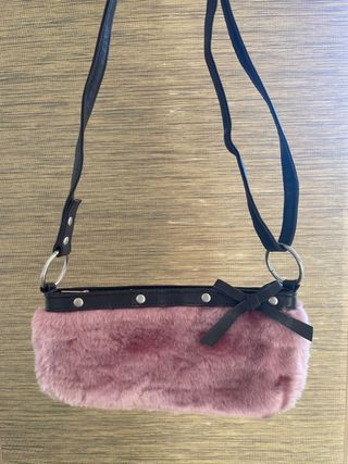 Bolso de pelo sintético en color rosa, ideal para niñas. Cuenta con detalles en piel sintética negra y un pequeño lazo decorativo. - Cierre de cremallera. - Asa larga ajustable con anillas metálicas. - Adornado con tachuelas plateadas.