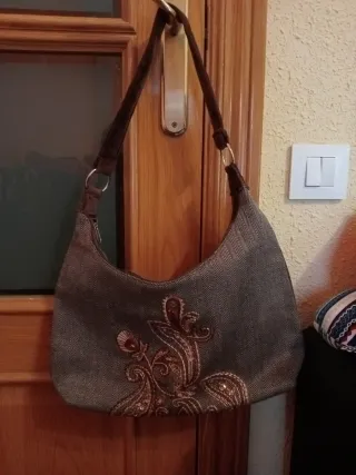 Bolso de hombro con un diseño elegante y detalles bordados. - Color principal marrón con detalles dorados. - Adorno floral y de estilo paisley. - Cierre de cremallera. - Correas de hombro con anillas metálicas.