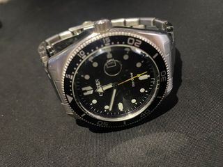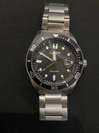 Reloj Citizen AW1760-81E con caja y brazalete de acero inoxidable. Un accesorio elegante y funcional. El reloj sería entregado en una caja negra con almohadilla sin marca y sin papeles si estarían incluidos los eslabones faltantes. Caja de acero, grosor 11,1 mm., con fondo cerrado a rosca. Bisel fijo acero con anillo de aluminio. Brazalete de acero con cierre de doble pulsador. Cristal mineral con lupa en ventana de calendario. Esfera negra. Agujas y marcas con luminous. Más detalles Código articulo: AW1760-81E Género: Hombre Tipo movimiento: Tecnología Eco Drive Material caja: Acero inoxidable. Cristal: Mineral