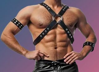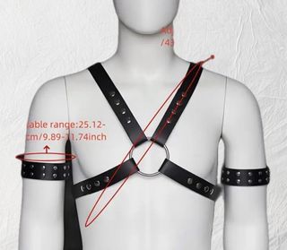 Este arnés de hombro es un accesorio llamativo y versátil. - Diseño en cuero sintético negro. - Hebillas y remaches metálicos. - Anillo central metálico. - Tiras ajustables para un calce personalizado. - Brazaletes a juego incluidos.