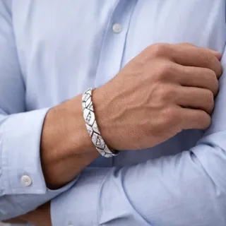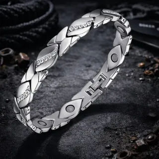 Elegante pulsera con un diseño entrelazado y detalles brillantes. Cuenta con incrustaciones, además de elementos magnéticos. - Diseño de eslabones entrelazados. - Acabado plateado brillante. - Elementos magnéticos integrados. - Se entrega con caja unboxing personalizada de regalo