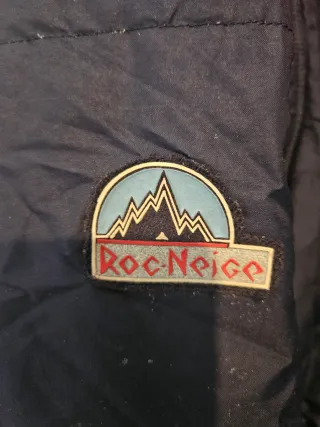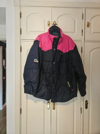 Abrigo acolchado de la marca Roc-Neige. La clásica de los año 90 - Diseño bicolor en azul marino y rosa. - Cierre de botones a presión. - Cuello alto. - Detalle de anilla en la parte frontal frontal - medidas: de axila a axila 72 cm, de hombro a hombro 55cm