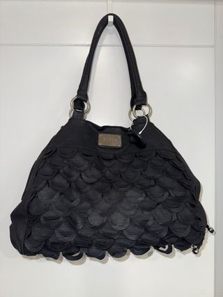 Bolso negro de la marca SUGHE con un diseño único. - Detalle de escamas en la parte frontal. - Asas con anillas metálicas. - Placa metálica con el logo de la marca.