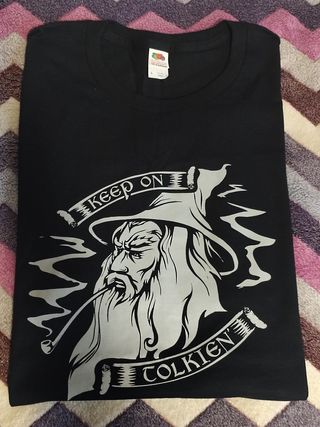 - Camiseta 'Keep on Tolkien', de El señor de los anillos. - Comprada en USA, por lo que la talla equivale a una XL española (medidas en las imágenes). - Marca de la camiseta Fruit of the Loom. - Completamente nueva.