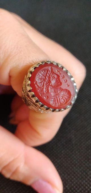 Precioso anillo de sello de estilo afgano. La montura es de plata de ley y la piedra es una cornalina de color rojo intenso. Luce un diseño antiguo y detallado. - Montura de plata de ley. - Piedra cornalina roja. - Diseño antiguo, tallado a mano. Anillo afgano de hombre de plata de plata. Presenta un diseño intrincado en la plata, con filigranas y detalles ornamentales, y una piedra ovalada con una talla en relieve que parece representar figura. Talla n° 20 equivalente a 19.1mm diámetro interior. Pesa 13.91 gramos. Medidas parte delantera 25.5 mm y cornalina 18.0 mm . Medidas parte trasera 6.3mm