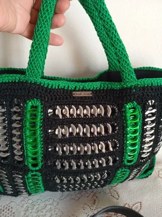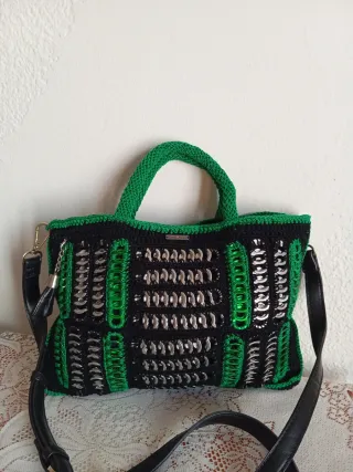 Bolso artesanal hecho a mano con crochet y anillas de lata. - Diseño único y original. - Combinación de negro y verde. - Incluye asa corta y correa larga. - Cierre de iman. Se puede llevar cruzado. Ancho-32 sm. Altura-23 sm.