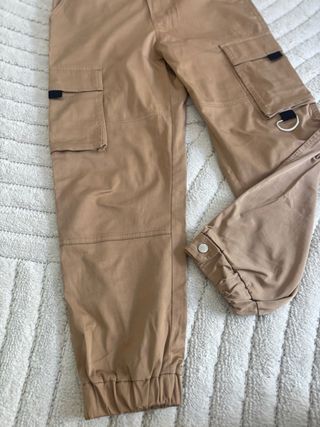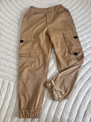 Pantalón de estilo cargo en color beige, ideal para un look casual y funcional. - Diseño con múltiples bolsillos. - Cintura elástica. - Puños ajustados en los tobillos. - Detalle de anilla en uno de los bolsillos.