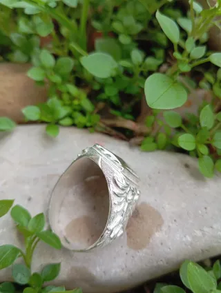 Anillo con un diseño detallado de hojas en relieve. Su acabado combina tonos plateados y oscuros para resaltar el patrón. - Diseño de hojas de marihuana -Macizo. -Talla aproximada. Ver medidas en las fotos.