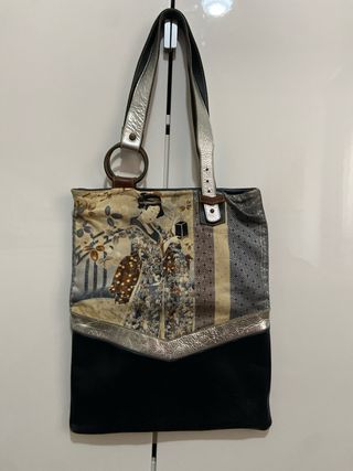 Bolso de la marca Masmona con un diseño único. - Estampado de geishas y motivos florales. - Detalles en plateado brillante. - Asas plateadas con anillas. - Base inferior en color azul marino.