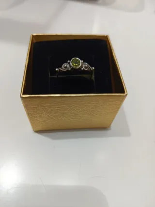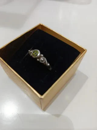 Elegante anillo de compromiso con una piedra central verde y un diseño de halo. Talla 6 - Piedra central ovalada de color verde. - Detalles de pequeñas piedras alrededor de la gema principal. - Banda de plata brillante.