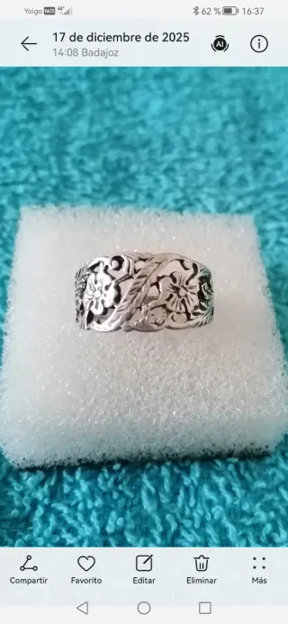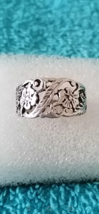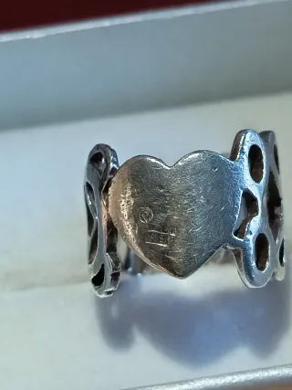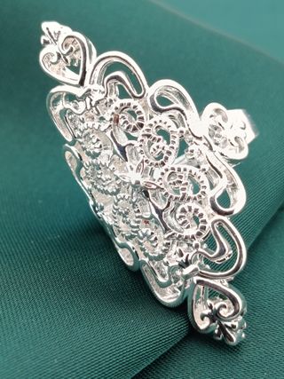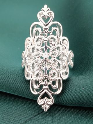 Espectacular anillo de plata de Ley 925, con un diseño intrincado de corazones y detalles calados. Es una pieza llamativa y elegante. - Plata de Ley 925. - Diseño abierto y ajustable. - Detalles calados con motivos de corazones. Talla española 18 aunque se puede ajustar un poco. Se entrega con caja de regalo. Visita nuestro perfil hacemos lotes y así pagas un solo envío.