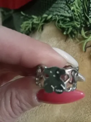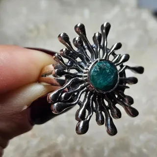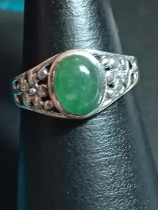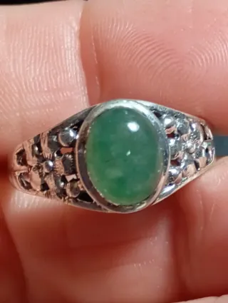 Anillo con un vidrio de mar de color verde y detalles plateados. Su tamaño es ajustable. - Piedra de forma ovalada. - Diseño abierto.