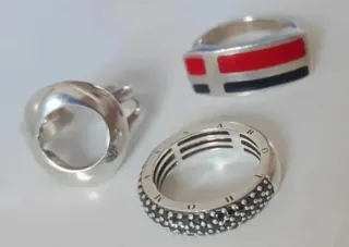 Conjunto de tres anillos con un diseño moderno y elegante. - Anillo con detalle circular grabado. - Anillo doble liso. - Anillo con eslabones. Medidas aproximadas: 1,8cm de diámetro y uno de los anillos es ajustable.