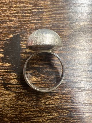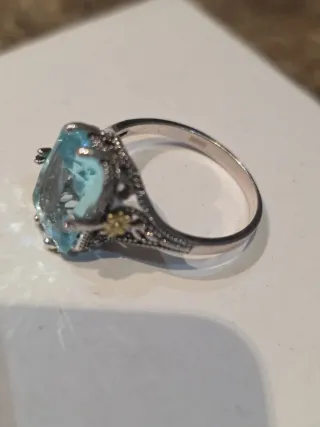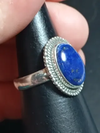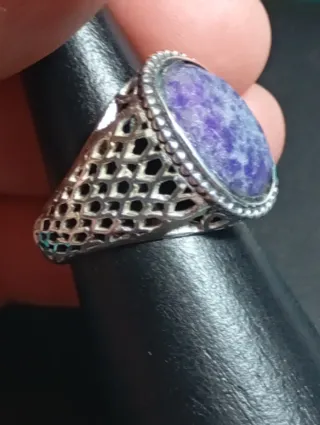 Anillo vintage de plata tono plateado con piedra azul (cabujón) Descripción: Anillo estilo vintage con montura trabajada tipo filigrana y piedra azul claro en cabujón (oval). La piedra presenta inclusiones/líneas internas naturales visibles según la luz (ver fotos). • Color piedra: azul claro • Forma: oval cabujón • Material montura: tono plateado 925, • Peso/piedra. 1,51 ct según info previa)