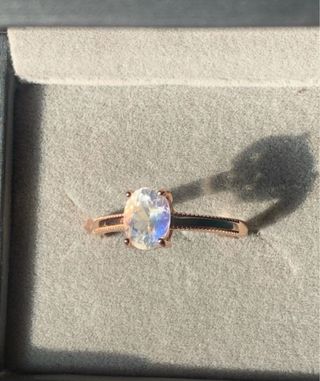 Elegante anillo de plata de ley con una piedra luna central en forma de marquise. Acompañada por dos piedras redondas a los lados. - Plata de ley. - Piedra luna central. - Diseño con tres piedras.
