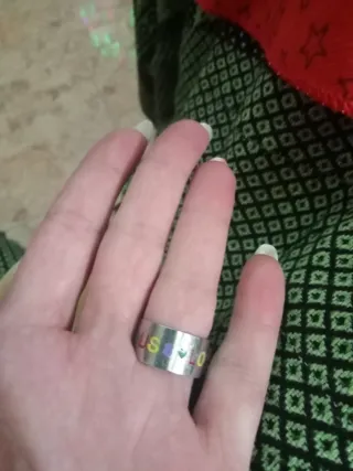 Anillo Tous con un diseño ovalado y multicolor. Presenta un patrón de pequeños recuadros con diferentes dibujos y colores. - Diseño ovalado. - Múltiples recuadros con motivos. - Combinación de colores vivos y plata.