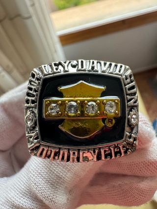 Anillo conmemorativo de Harley Davidson. - Diseño con el logo clásico de la marca. - Detalles en color dorado y plateado. - Inserciones de piedras brillantes.
