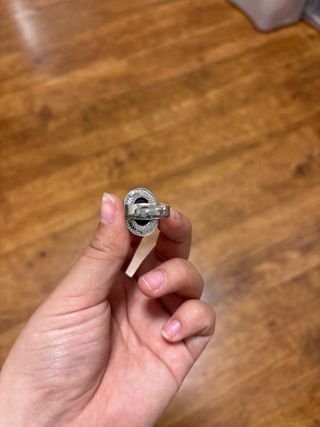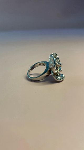 Anillo de bisutería, color plata, con piedras tipo circonitas y piedra solitario azul. Talla 13 (6 americana) . En perfecto estado.