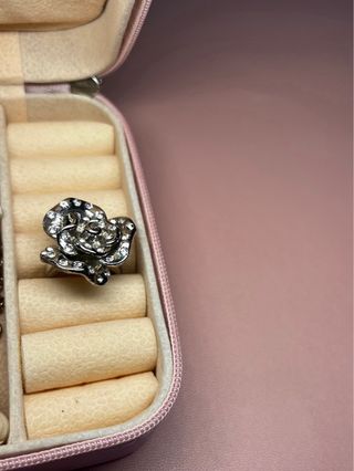 Anillo con diseño de flor en tonos plateados y brillantes. Su tamaño es ajustable para adaptarse cómodamente. - Detalle de pequeña piedra en el centro de la flor. - Acabado envejecido que le da un toque único. -anillo artesanal hecho a mano