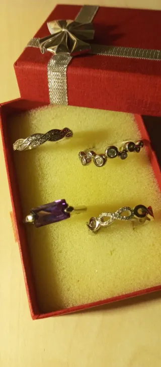Conjunto de anillos de plata con detalles brillantes y una piedra morada. - Diseño elegante y moderno. - Piedra central de corte rectangular en tono morado. - Anillos con circonitas incrustadas. Se puede comprar el conjunto entero y también por separado. Conjunto 40€ Anillos por separado 13€ la unidad
