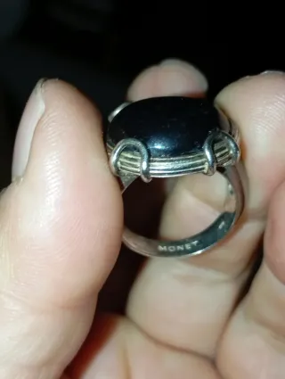 Elegante anillo vintage de la marca Monet con una piedra de Onix. - Diseño con detalles plateados. - Piedra central de Onix. - Estilo vintage. La talla no lo sé.