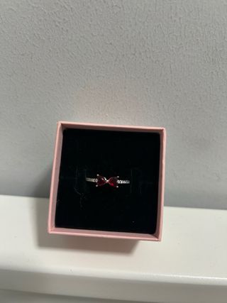 Anillo con diseño de lazo en color rojo y detalles plateados. - Dos gemas rojas en forma de lágrima. - Banda adornada con pequeñas piedras transparentes.