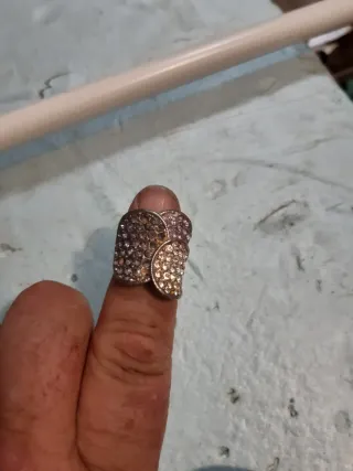 Anillo con un diseño elegante y adornado con múltiples piedras. - Diseño de pétalos o escamas. - Detalles brillantes en tonos rosas y plateados.