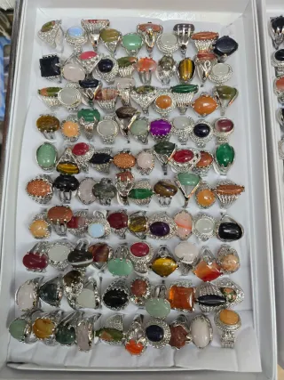 Este lote incluye 100 anillos con monturas de metal y piedras de diversos colores y formas. - Diseños variados. - Piedras naturales y sintéticas. - Monturas de metal plateado.