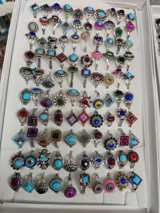 Anillos Anillos artesanales Preciosos anillos de estilo étnico, con piedras de colores. Son 50 anillos en total, ideales para regalar o para uso personal. Cada anillo tiene un diseño único y llamativo. Se aprecian detalles dorados y plateados en los metales. Son de diferentes tallas. De hecho son importados de Turquía. 1,5 € cada anillo.