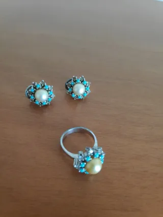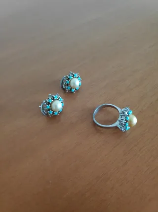 Conjunto de Joyería Vintage con perlas y turquesas. Este conjunto de joyería es un juego de pendientes y anillo de Plata de Ley 925 con perlas y turquesas, de estilo vintage o antiguo. -Epoca: Finales de los años 60. -Materiales: Plata de ley (925), perlas cultivadas y piedras de turquesa y Circonitas. -Diseño: Estilo floral o de halo, con una perla central rodeada de pequeñas turquesas y pequeñas Circonitas montadas en Plata de Ley de 925. -Dimensiones del anillo: 1,98 cmtrs de Diámetro. -Estado: Muy Bueno. Perfectamente conservado.