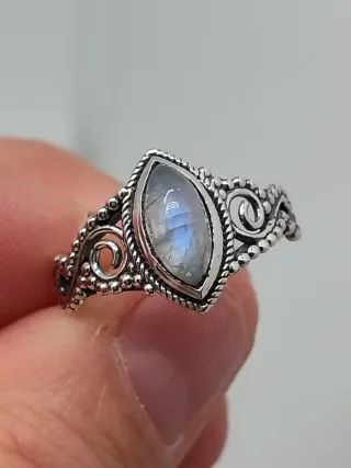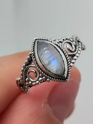 Elegante anillo de plata de ley 925 con una piedra luna central en talla marquise. Su diseño intrincado le da un toque bohemio y sofisticado. - Material: Plata de Ley 925. - Piedra: Piedra Luna. - Talla de la piedra: Marquise. - Talla 14/54 17,1 milímetros