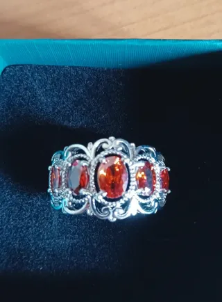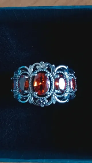 Elegante anillo de estilo vintage con un diseño intrincado y piedras de color rojo intenso. - Elaborado en plata 925 - Diseño con múltiples piedras ovaladas.