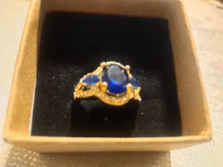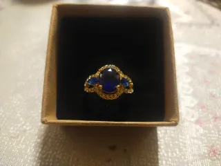 Elegante anillo con un diseño llamativo. - Piedra central azul ovalada. - Detalles de pequeñas piedras transparentes. - Montura dorada. Incluye caja de regalo