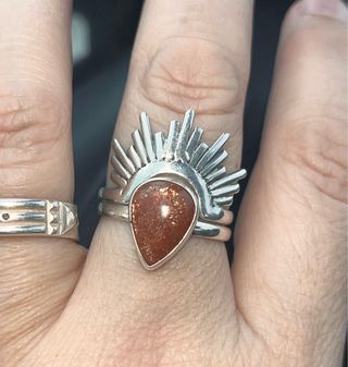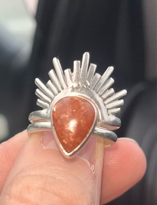 Anillo doble con piedra sol en plata 925. - Diseño con rayos. - Piedra con destellos naranjas.