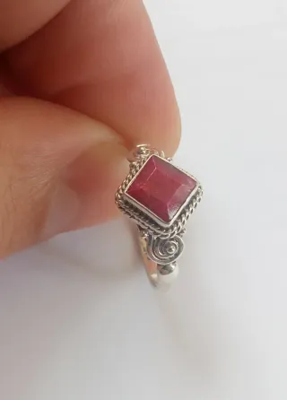 Elegante anillo de plata de ley 925 con un detalle central de piedra roja. - Diseño con detalles en espiral. - Acabado pulido de la plata.
