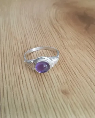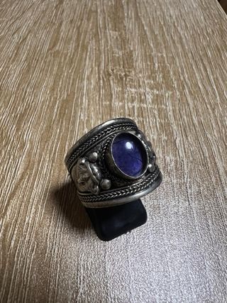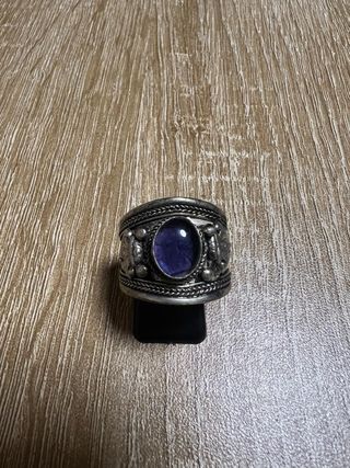 Anillo de estilo tibetano vintage con una hermosa amatista central. - Diseño intrincado con detalles plateados. - Piedra central ovalada de color amatista. - Hecho en Nepal. - Detalle grabado de Dorje tibetano. - Ajustable.