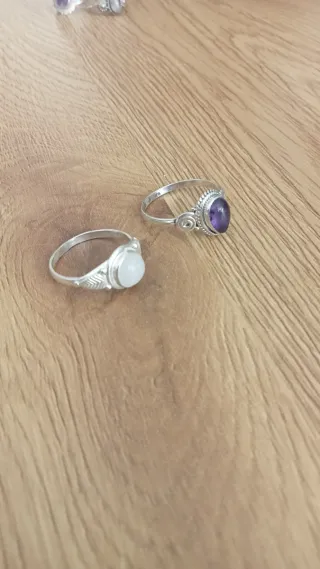 Conjunto de dos anillos de plata de ley 925. - Diseño elegante con piedra morada. - Otro anillo con piedra grisácea y detalles. - Plata de ley 925.