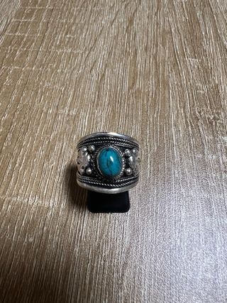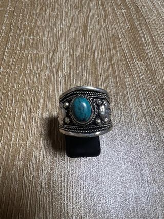 Anillo de estilo tibetano vintage con una hermosa turquesa central. - Diseño intrincado con detalles plateados. - Piedra turquesa central ovalada. - Hecho en Nepal. - Detalle grabado de Dorje tibetano. - Ajustable.