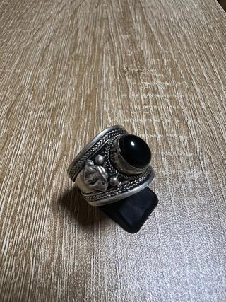 Anillo de estilo tibetano vintage con un hermoso Onix negro central. - Diseño intrincado con detalles plateados. - Piedra natural central ovalada. - Hecho en Nepal. - Detalle grabado de Dorje tibetano. - Ajustable.