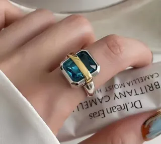 Elegante anillo con un diseño moderno y llamativo. Plata 925 - Piedra central de corte rectangular en tono azul profundo. - Detalles metálicos en dorado que contrastan con la montura plateada.