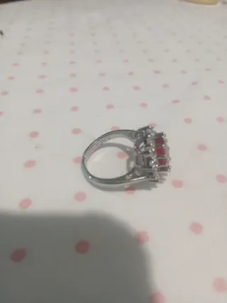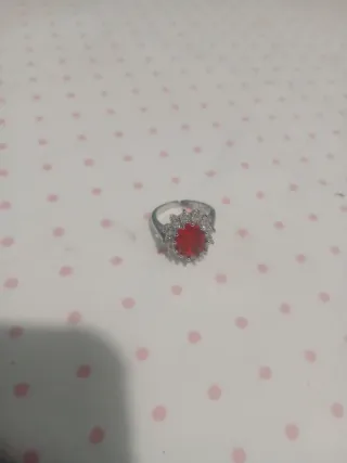 Elegante anillo de plata con un diseño llamativo. - Piedra central de color rojo. - Detalles de pequeñas piedras alrededor de la gema principal. - Diseño abierto para ajuste a diferentes tamaños de dedo.