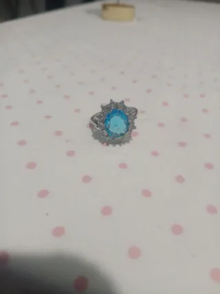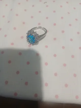 Elegante anillo de plata con una piedra central azul rodeada de pequeñas gemas transparentes. - Diseño floral. - Acabado plateado brillante.