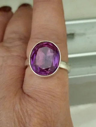 Anillo de plata ,sellado 925 con un diseño llamativo y una piedra central de color morado. - Montura de plata. - Diseño con detalles ornamentales.