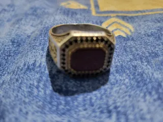 Anillo de plata con un diseño llamativo y una piedra central. - Anillo de plata. - Piedra central de color rojo.