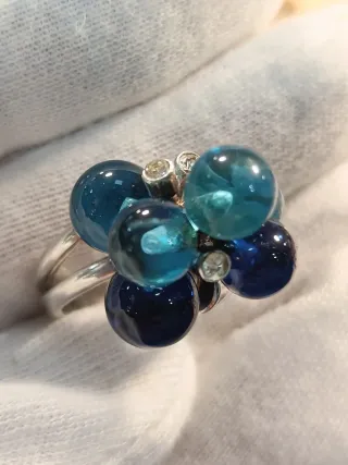 Anillo con un diseño único y llamativo, inspirado en el estilo de Cartier. - Elaborado con detalles en plata. - Presenta un conjunto de esferas en tonos azules. Ver las fotos del estado Le falta una piedra