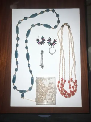 Conjunto de bisutería con un collar largo de cuentas azules y doradas, un collar de perlas y coral, unos pendientes llamativos, un anillo y un broche. - Collar largo con cuentas ovaladas y redondas en tonos azules y detalles dorados. - Collar de varias vueltas con perlas y trozos de coral. - Pendientes tipo abanico con cristales de colores. - Anillo plateado con una pequeña piedra. - Broche plateado con diseño clásico.
