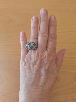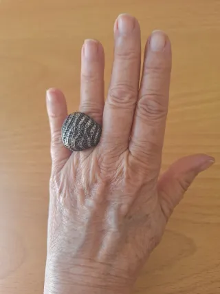 Elegante sortija con un diseño llamativo. - Diseño curvo con bandas alternas. - Incrustaciones de pequeñas piedras. - Acabado en plata y negro.
