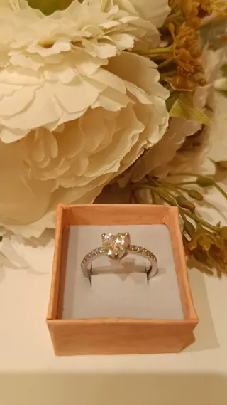 Elegante anillo con un diseño de corazón en el centro. La banda está adornada con pequeñas piedras brillantes. - Anillo con baño de plata. - Diseño de corazón. - Banda con incrustaciones.